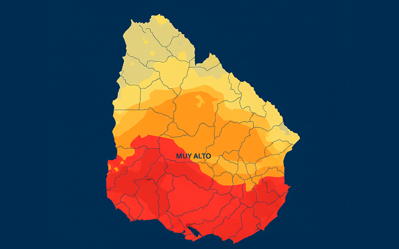 El Instituto Uruguayo de Meteorología (INUMET) emitió un informe de actualización sobre el Índice de Peligro de Incendios Forestales (FWI), confirmando un escenario preocupante para el cierre del año. Según el mapa técnico, el color rojo predomina en la cartografía nacional, indicando un riesgo «Muy Alto» de ocurrencia y propagación de fuegos, especialmente en la franja sur, el litoral oeste y la zona este del país.